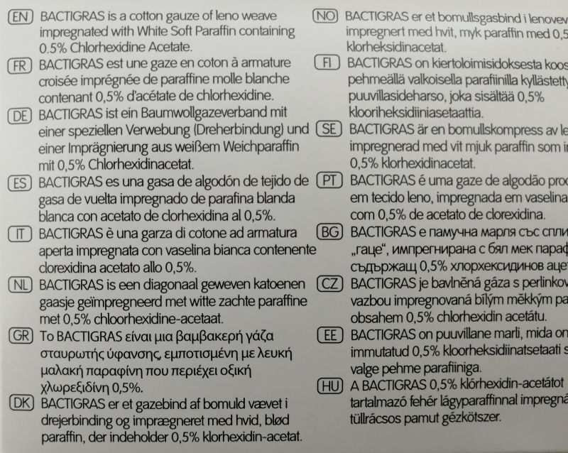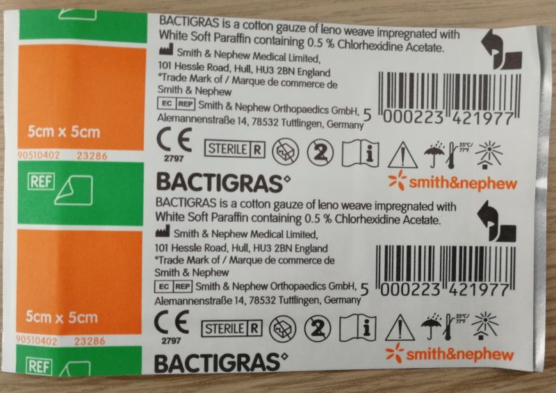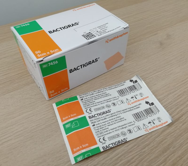 Bactigras è una medicazione sterile costituita da una garza in cotone ad armatura aperta uniformemente impregnata con vaselina bianca che contiene clorexidina acetato allo 0.5%.