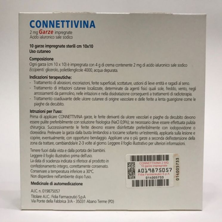 Connettivina Garze stimola la riparazione e la rigenerazione della pelle, accelerando la guarigione di abrasioni, escoriazioni, ferite superficiali, scottature, ustioni di lieve entità e ragadi al seno.