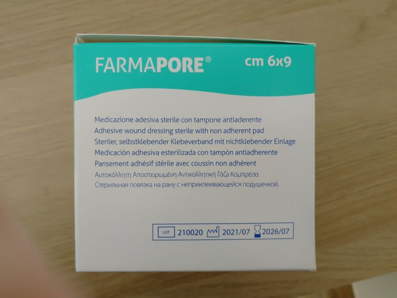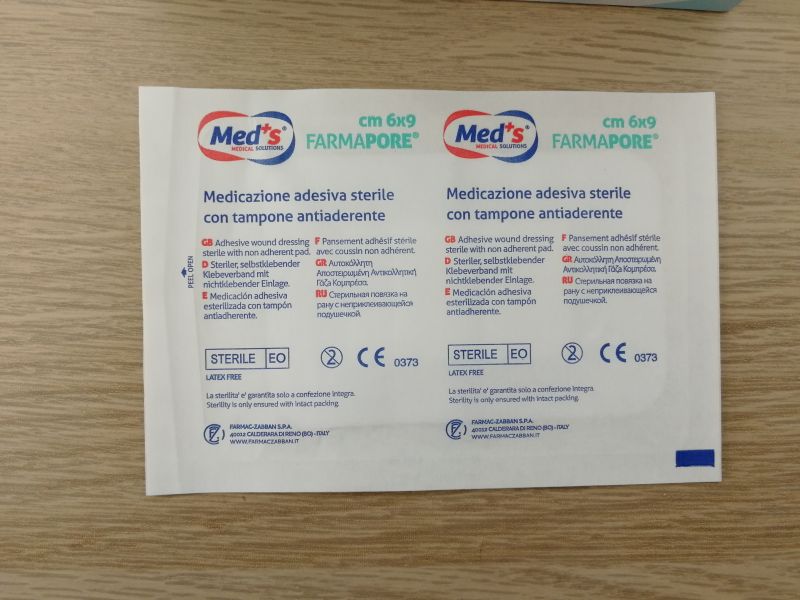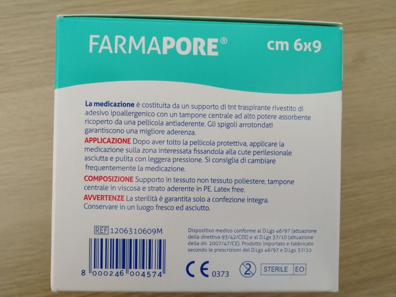 la medicazione è costituita da un supporto di tnt traspirante rivestito di adesivo ipoallergenico con un tamponde centrale ad alto potere assorbente ricoperto da una pellicola antiaderente. Gli spigoli arrotondati garantiscono una migliore aderenza.