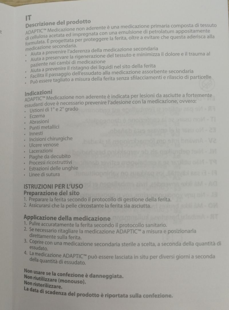 ADAPTIC medicazione non aderente è una medicazione primaria composta di tessuto di cellulosa acetata ed impregnata con una emulsione di petrolatum appositamente formulata. E’ progettata per proteggere la ferita, oltre a evitare che questa aderisca alla medicazione secondaria.