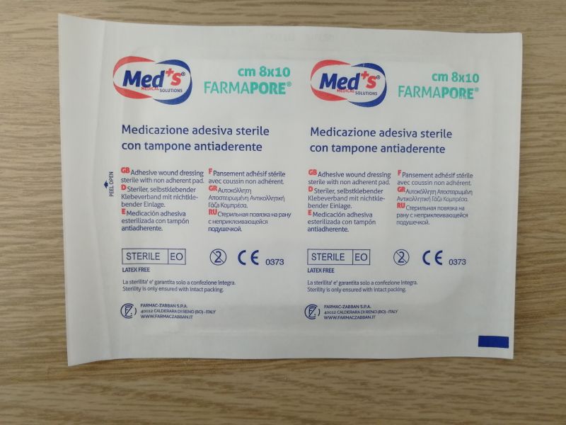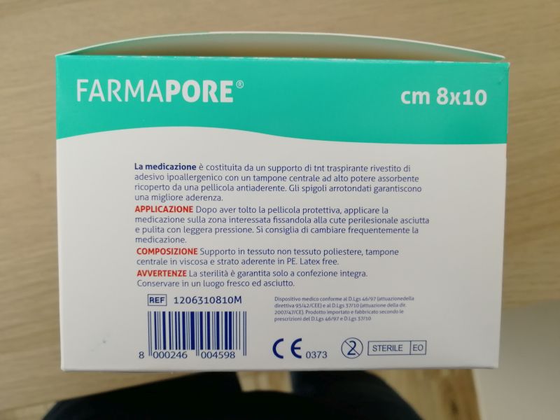la medicazione è costituita da un supporto di tnt traspirante rivestito di adesivo ipoallergenico con un tamponde centrale ad alto potere assorbente ricoperto da una pellicola antiaderente. Gli spigoli arrotondati garantiscono una migliore aderenza.
