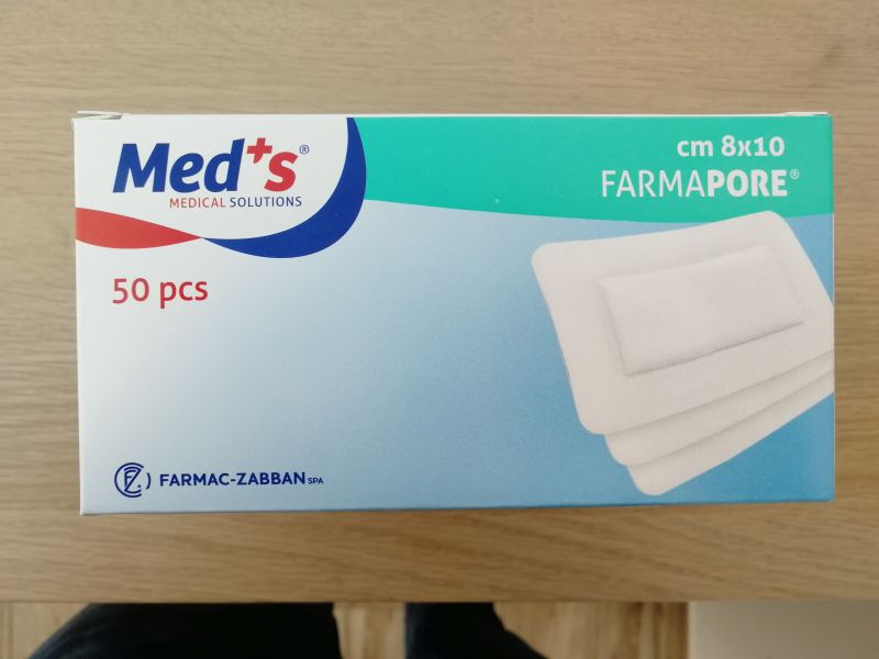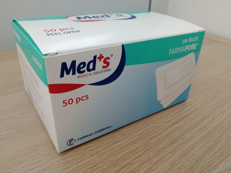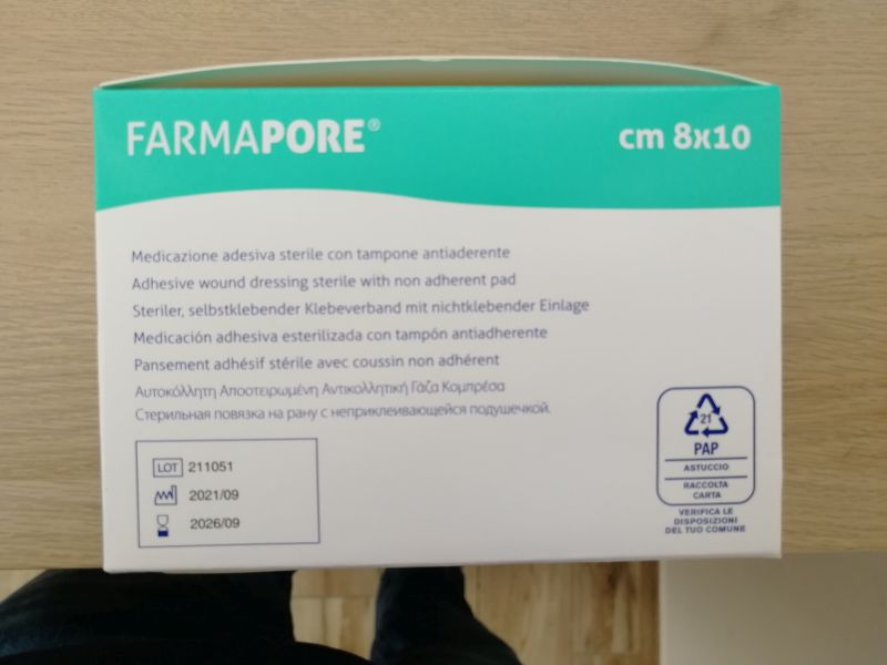 Medicazione adesiva sterile con tampone antiaderente FARMAPORE. Dimensioni cm 8×10